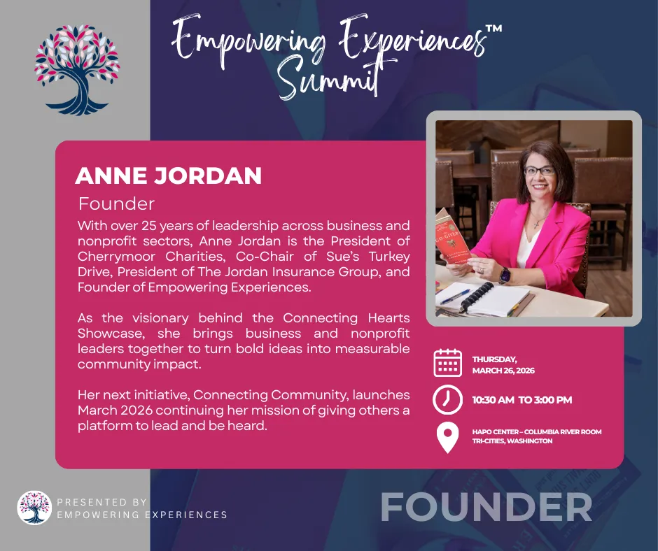 Welcome to the Empowering Experiences Summit by me, Anne Jordan, Strategist, Founder of Empowering Experiences™—an immersive experience I’ve curated to help you elevate your mindset and awaken your inner strength. I’ve designed this summit to blend inspiration, introspection, and intention, guiding you toward deeper clarity and empowered living. Step into this refined space of growth, created for you to become your best self.